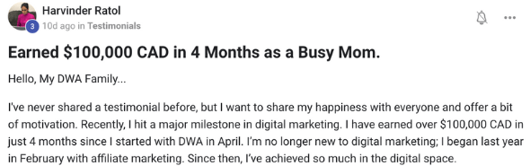 Through DWA, I learned how to resell digital courses, leverage online strategies, and create a profitable income stream while managing my home and studies. Now, I’m here to share the same knowledge that helped me succeed. If I can do it, so can you!